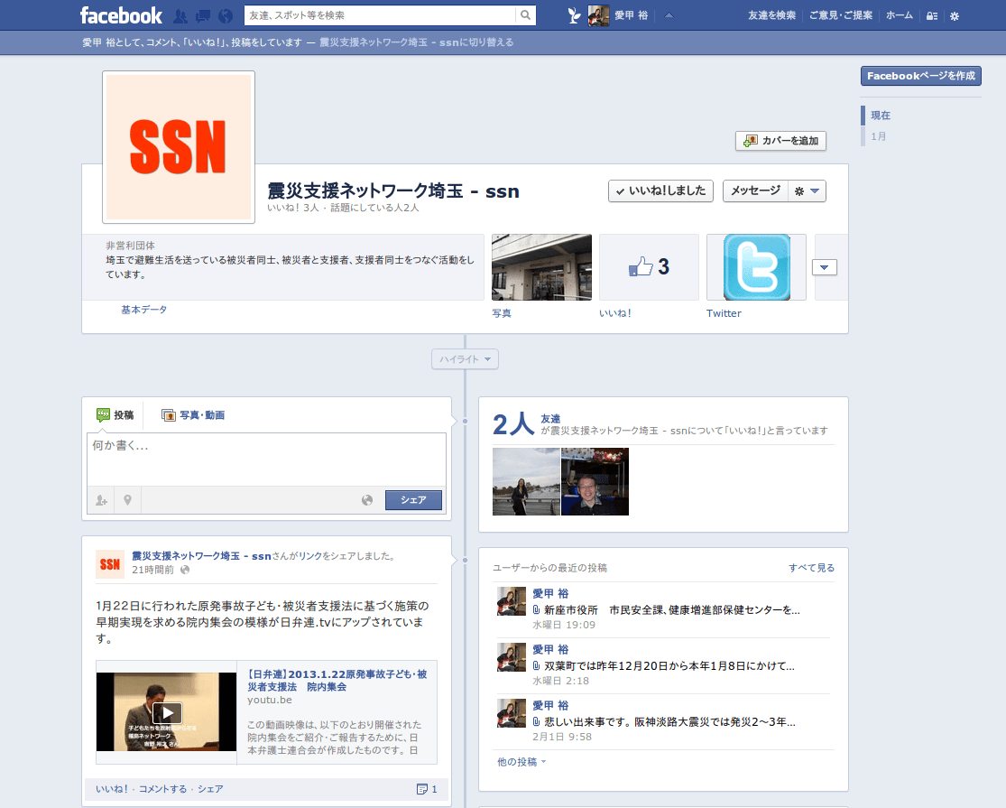 Facebookを始めました 震災支援ネットワーク埼玉(SSN)のフェースブックを始めました。 http://www.facebook.com/ssn431279 最新の状況は、このページの右下に表示されます。 Facebookでも、よろしくお願いいたします。 ツイート « ホームページ・リニューアル中です。 2/16(土)【さいたま市】原発事故子ども・被災者支援法セミナー »